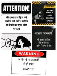 श्री दरबार साहिब प्रशासन ने कोर्ट आदेश की प्रति थाना क्लेमेनटाउन को भी सौंपी, लेकिन इसके बावजूद उक्त स्थल पर अवैध कार्य जारी रहा। इतना ही नहीं, विपक्षीगणों द्वारा उक्त विवादित भूमि को 100 वर्गगज के प्लॉट के रूप में ₹22 लाख में बेचने की सूचना भी प्रसारित की गई, जो पूरी तरह गैरकानूनी और भ्रामक है। इस प्रकरण से जुड़ी जानकारियां इस बात की तस्दीक करती हैं कि इस तरह के झूठे प्रचार में आकर इस विवादित भूमि को खरीदने का प्रयास कोई भी न करे। यह भूमि कानूनी रूप से श्री दरबार साहिब की संपत्ति है और इस विषय पर माननीय न्यायालय ने श्री दरबार साहिब के पक्ष में फैसला सुनाया है। प्रशासन ने चेतावनी दी है कि यदि कोई व्यक्ति इस भूमि को खरीदने का प्रयास करता है, तो वह स्वयं कानूनी परिणामों के लिए उत्तरदायी होगा।